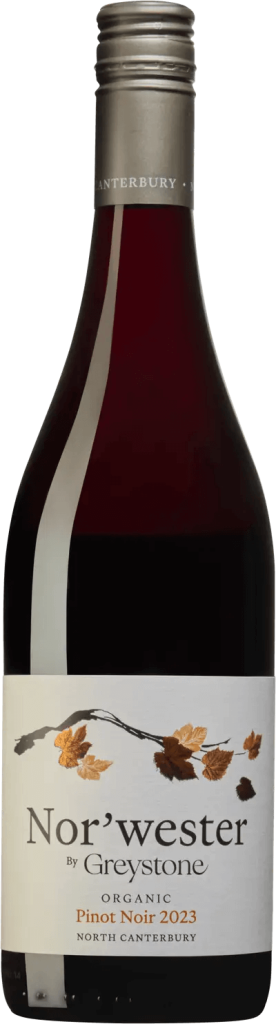 Greystone Wines Nor’wester Pinot Noir 2023 är ett elegant och ekologiskt vin från North Canterbury, Nya Zeeland. Det bjuder på rik rödfrukt balans med hallon, jordgubbar och inslag av sandelträ, rostade nötter, blodapelsin och kakao. Mjuk, mineraldriven eftersmak – perfekt till ljust kött eller vegetariskt.