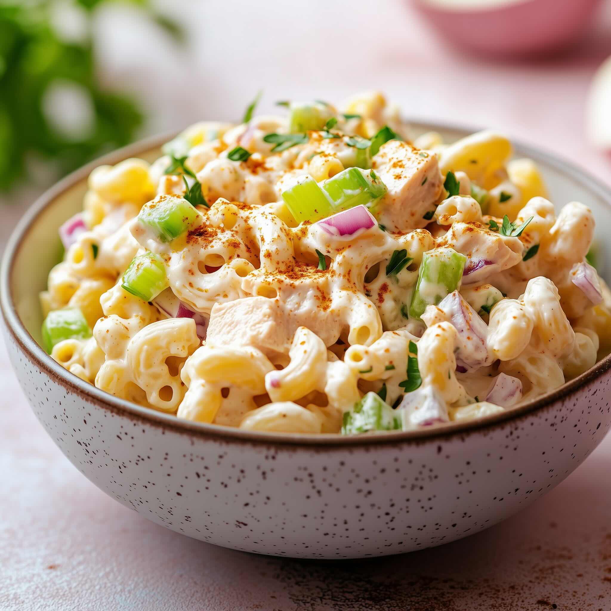 Denna krämiga pastasallad kombinerar kokt pasta med en ljuvligt fyllig sås gjord på majonnäs och crème fraîche. Tillsammans med knapriga grönsaker och saftiga bitar av kyckling eller skinka får du en perfekt balans mellan krämighet och textur. Pastasalladen är lätt att anpassa efter dina egna smakpreferenser och kan serveras kall till både lunch och middag.